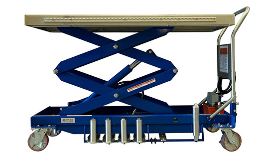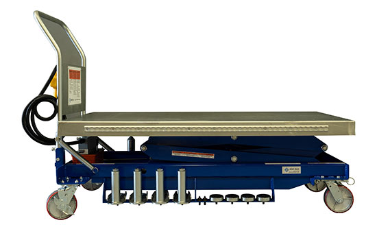 - Flow control valve allows speed adjustment when lowering the table, ensuring safety when handling heavy objects.